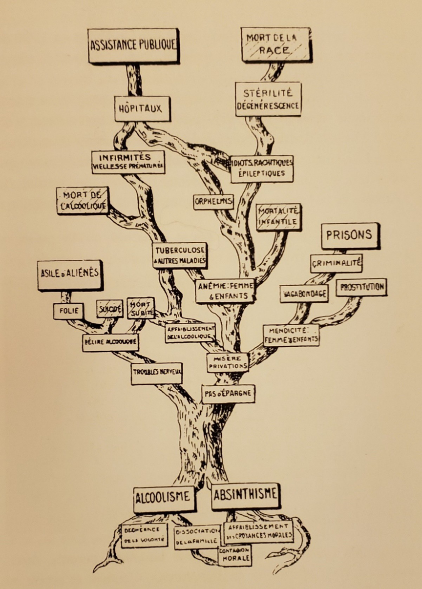 25 Reprinted as « Arbre généalogique mettant en parallèle l’alcoolisme et l’absinthisme. Édité en carte postale par la Ligue National Contre l’Alcoolisme. » in Delahaye, L’absinthe: Son Histoire, Collection Artemisia 3 (2001), 255. Also, labeled L’absinthe, fléau social in Delahaye, 1983, 129.