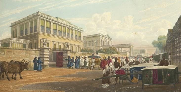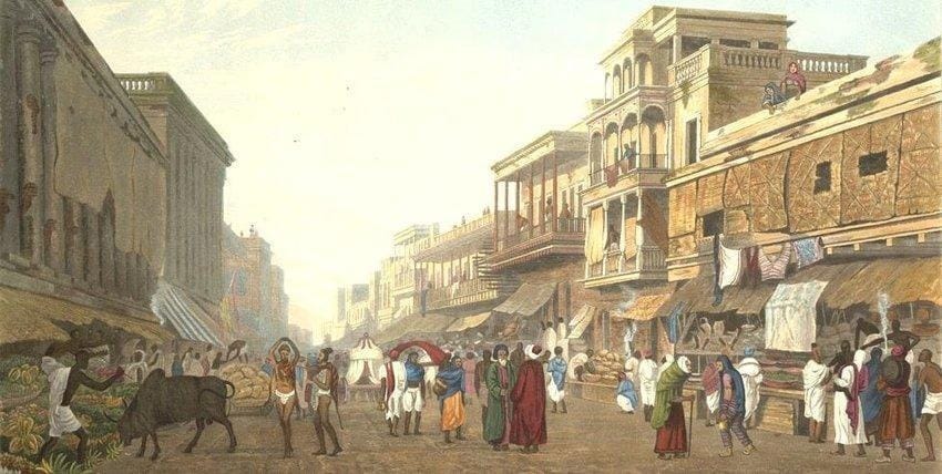 Fraser, James Baillie (1783-1856). A View in the Lal Bazaar leading to the Chitpore Road, on the north side of Dalhousie Square in Calcutta, 1826. Aquatint, 11 x 16 in. Printed in Fraser's Views in Calcutta, Collection of the Victoria and Albert Museum.
