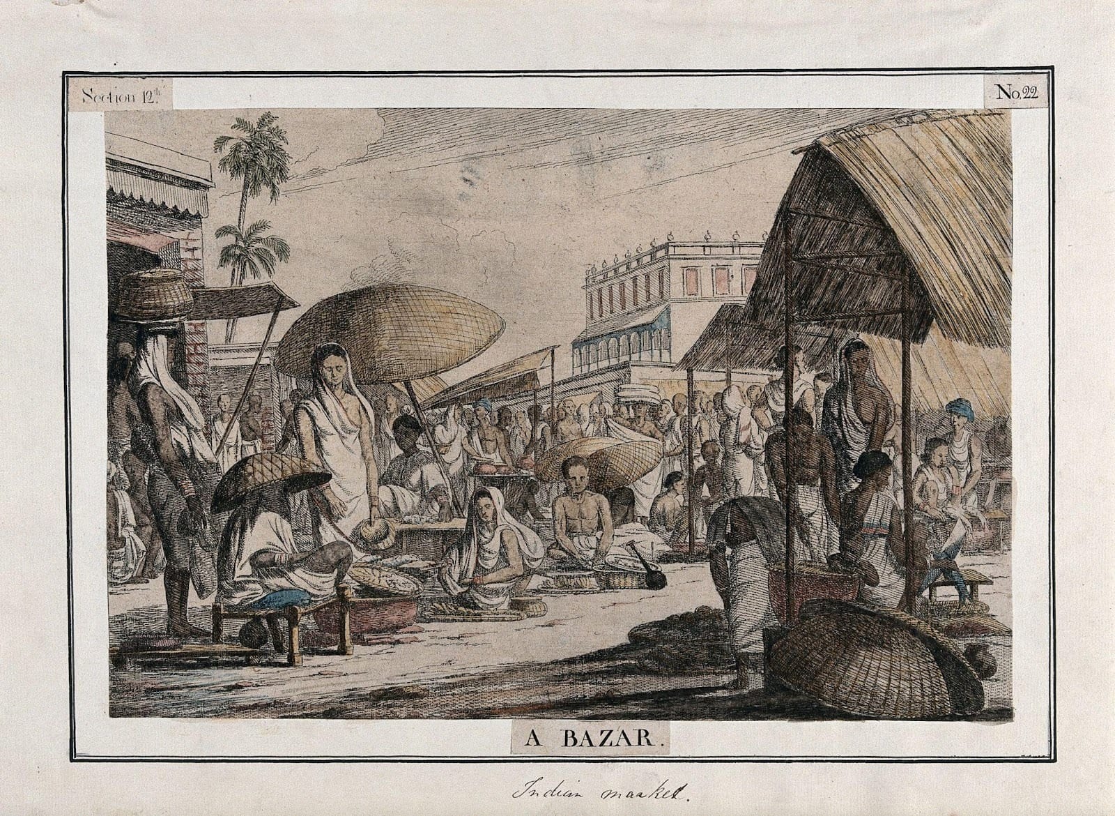 Solvyns, Balthazar (1760-1824). Market Scene, Calcutta, West Bengal. 1799. Etching with watercolor. Wellcome Collection. Image via JSTOR.