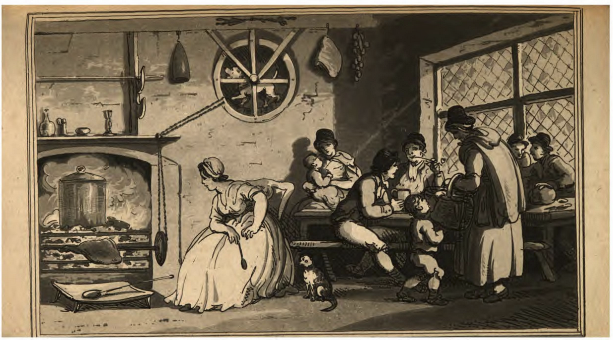 “There is comprehended, vnder the curres of the coursest kinde, a certaine dogge in kytchen seruice excellent. For whe any meate is to bee roasted they go into a wheele which they turning rounde about with the waight of their bodies, so diligently looke to their businesse, that no drudge nor skullion can doe the feate more cunningly.”