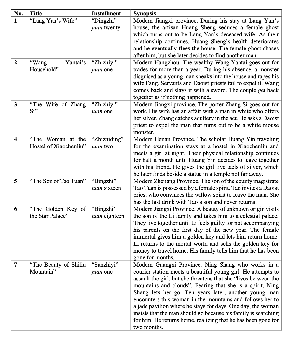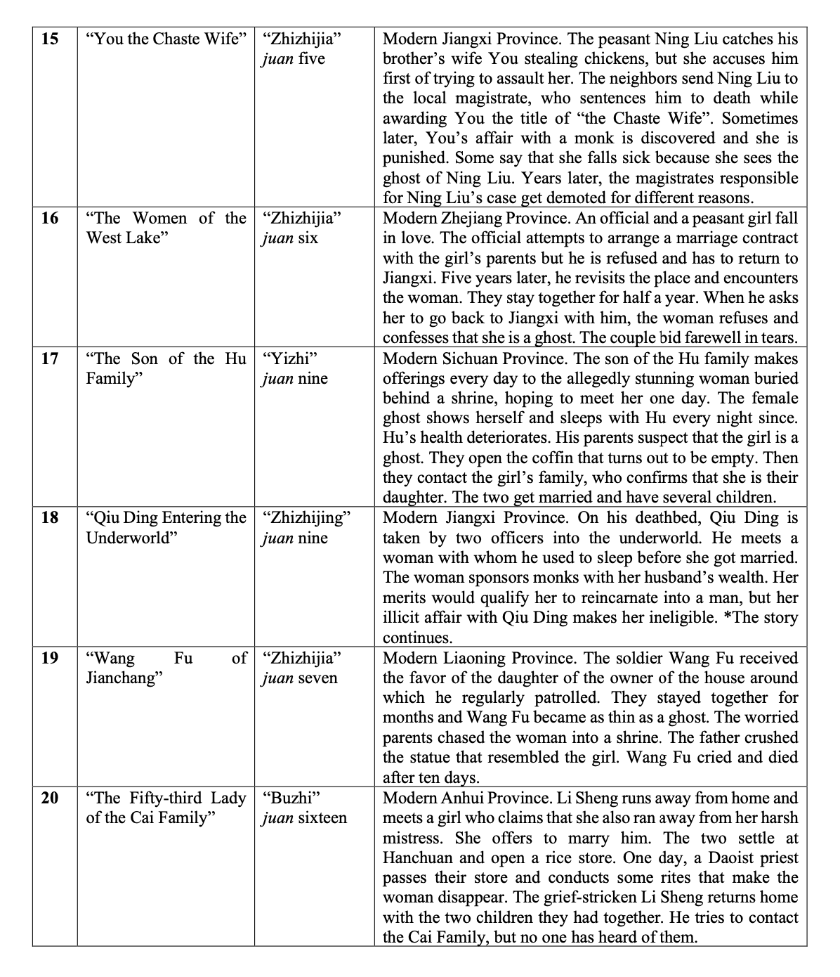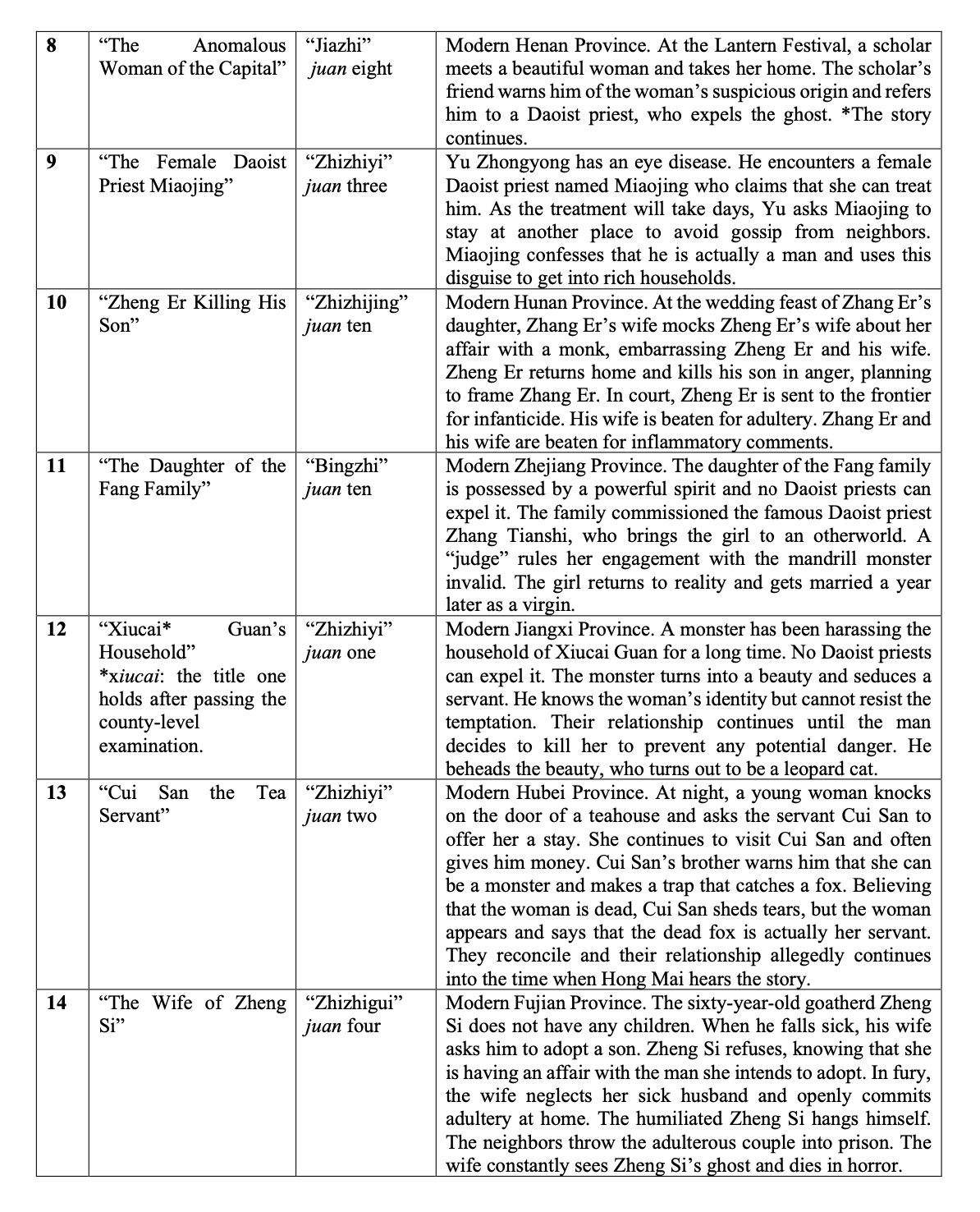 Synopses of Selected Stories from ‘Yijian zhi’